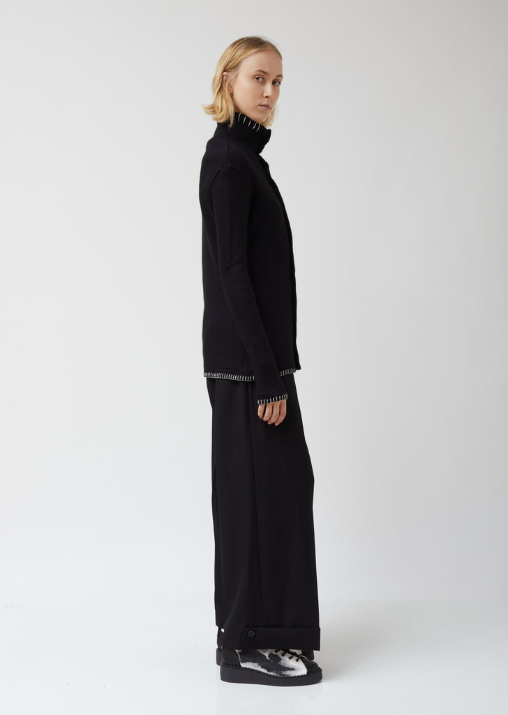 Fitted mockneck cardigan fine-gauge-knitted from angora-lambswool-blend yarn, finished with contrast-tone blanket-stitch details in various widths at the topline, right cuff, and hem. Slightly dropped shoulders. Long sleeves. Tonal-button front. Straight hem falls to lower hip. Fitted silhouette.