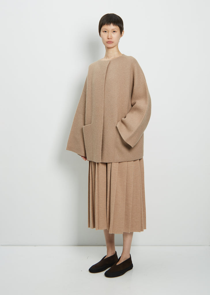 Lauren Manoogian collarless open knit coat with patch pockets in felted baby alpaca and fine merino wool. Dropped shoulders with wide sleeves. Clean edge finish throughout. Oversized fit.