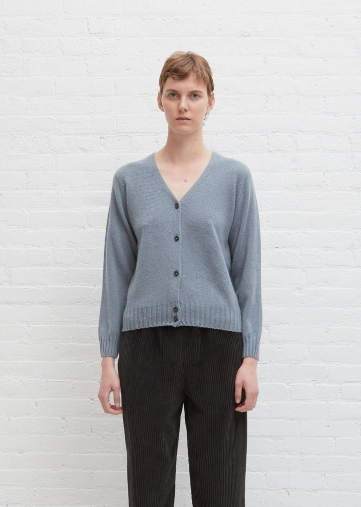 Margaret Howell classic V-neck cardigan in cashmere. Ribbed finish at neckline, cuffs and hem. Finished with contrast black buttons. Easy, loose fit.