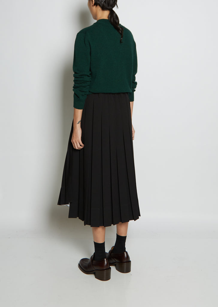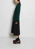Plan C v-neck cardigan sweater with signature rubber patch in a deep green wool cashmere knit. Features dropped shoulders with a rib trim finish at the neck, sleeves and hem.