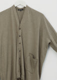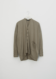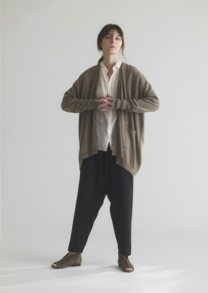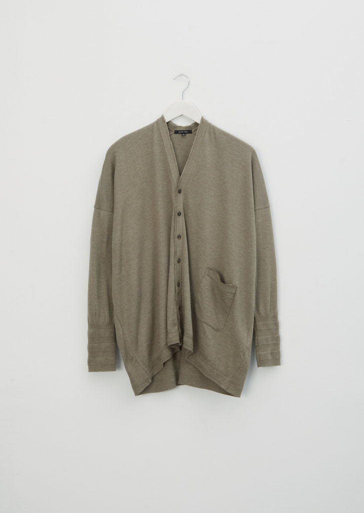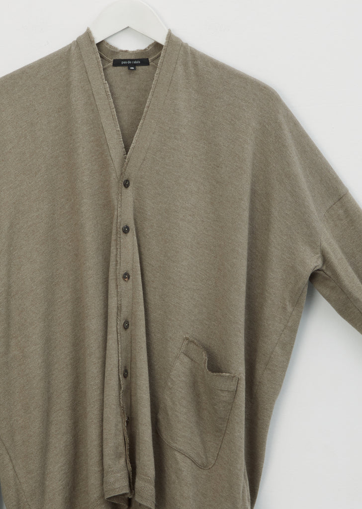 Spring-Summer '21 Collection — Pas de Calais V-neck cardigan with fringe detailing at neckline in a smooth cotton & viscose knit with a hint of luster from silk. Detailed with a single pocket to left side. Softly draped sleeves and hem. Cocoon silhouette with an oversized fit.