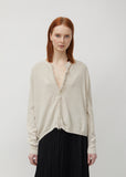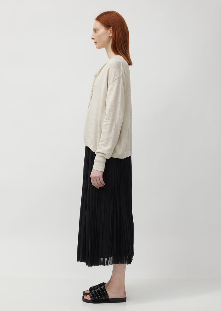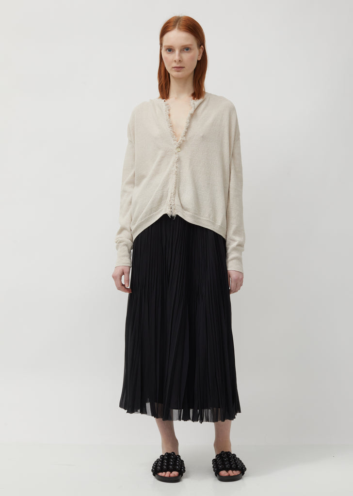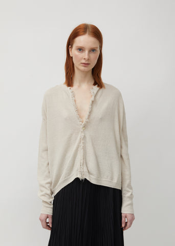 Pale-beige Y-neck knit cardigan stockinette-stitched from lightweight cotton-linen-blend yarn, featuring a single-button front fastening and pulled-fringe edges at the front body panels.