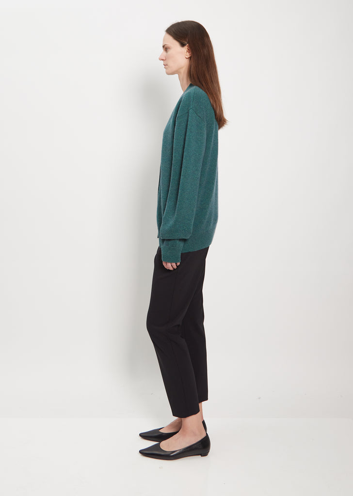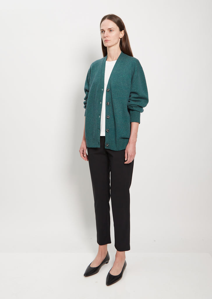 6397 peacock cardigan with a v-neckline in mercerized wool and cashmere knit. Features slightly dropped shoulders, clean placket, and rib trim finish along cuffs and hem. Finished with shell buttons.