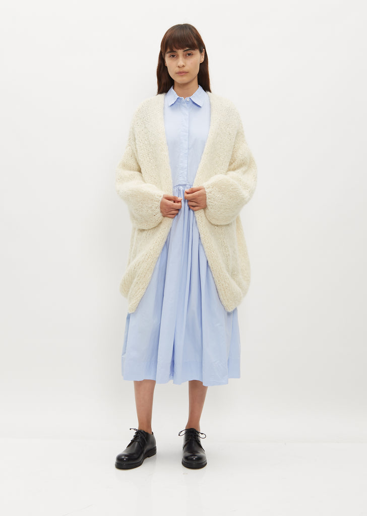 Casey Casey porcelain long open-front cardigan hand knitted in kid mohair and polyamide yarns. Features balloon sleeves and dropped shoulders.