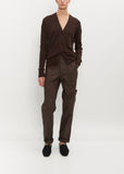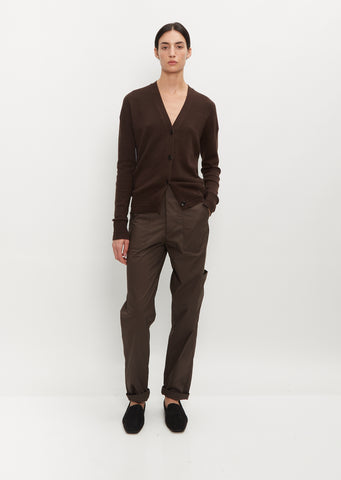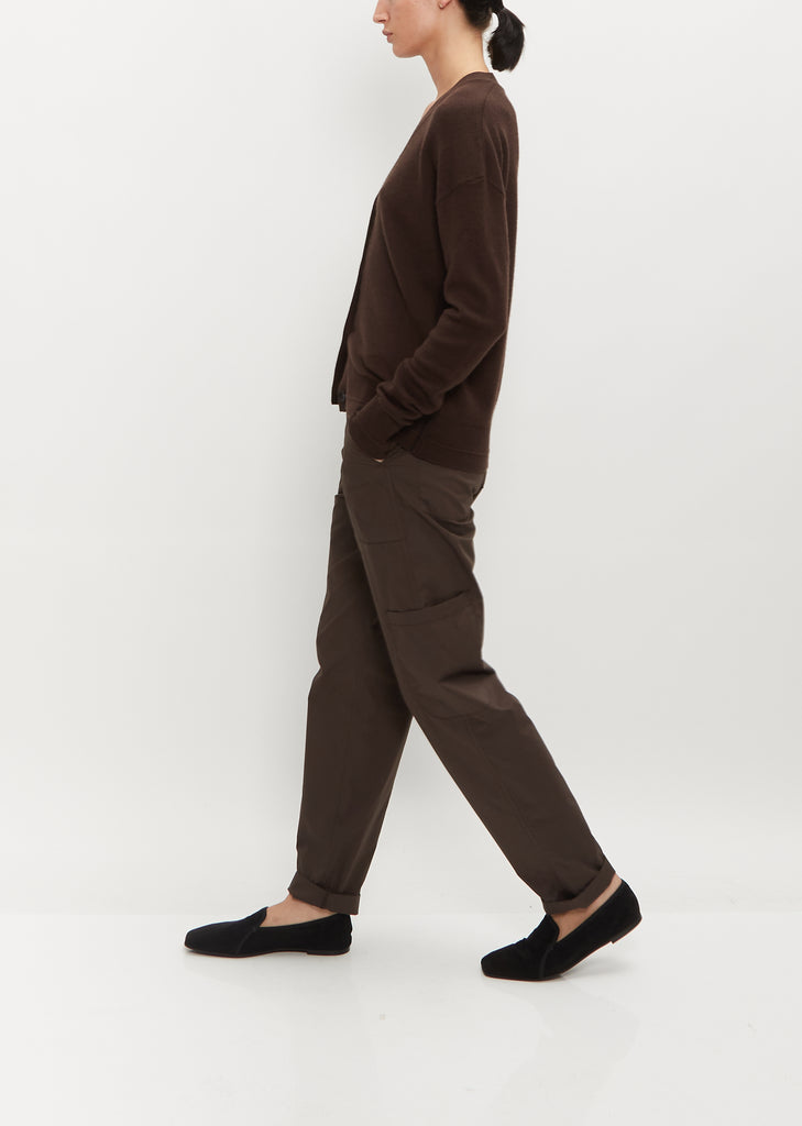 Maria McManus chocolate and black cardigan with a V-neckline knit in a blend of Italian recycled cashmere (certified by the Global Recycled Standard) & organic cotton (certified by the Global Organic Textile Standard). Features elongated sleeves, slightly dropped shoulders, and a slouchy fit in the body. Finished with our plant-based Corozo buttons derived from the seed or nut of the tagua palm tree.