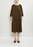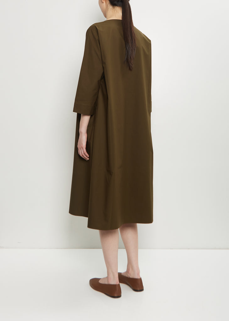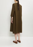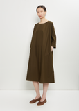Apuntob forest green pullover A-line dress with 3/4 length dolman sleeves in soft cotton. Features a round neckline and side seam pockets. Relaxed fit.