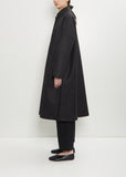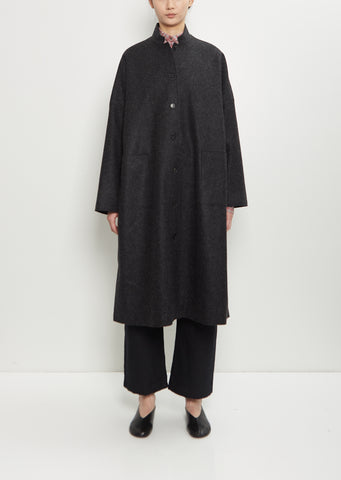 Apuntob black coat with a stand collar and black horn-hued button front in felted virgin wool. Features dropped shoulders and deep front patch pockets. Lined in beige cotton fabric. Relaxed fit.