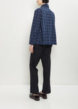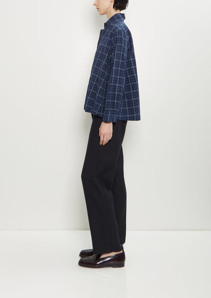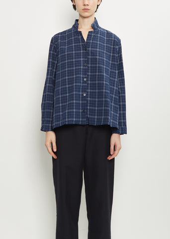 Bergfabel navy window check shirt with V-neckline and notched collar in cotton poplin. Features black button front, buttoned cuffs, and straight hem.