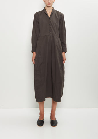 Bergfabel dark green long sleeve dress with stand collar that can be worn up or down in soft cotton. Features a three black button closure, slightly raised waist, balloon skirt, and concealed side seam pockets. Regular fit.