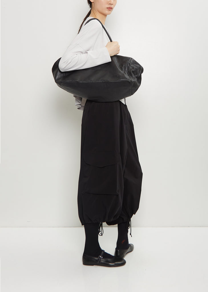 Bea Mombaers black new shoulder bag with tubular top handles and double zip top closure in matte buffalo leather. Features a single interior zippered pocket, an interior slip pocket, and a detachable clasp key ring. Lined in cotton canvas.