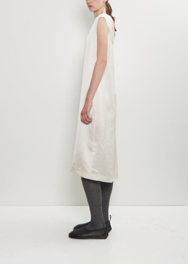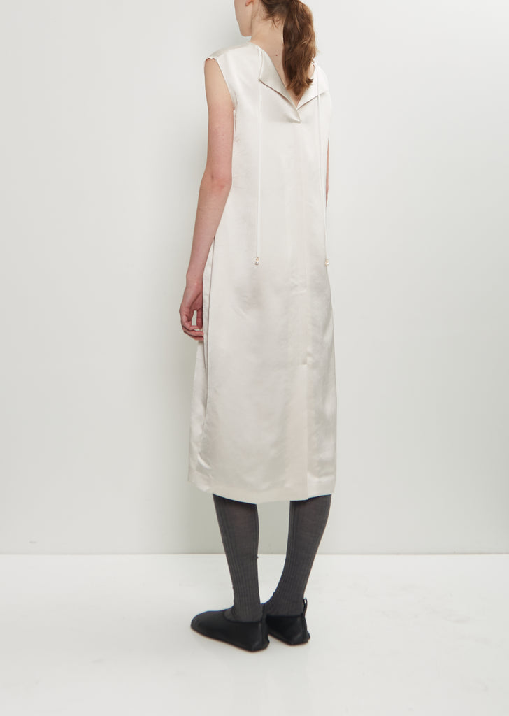 Carven ecru sleeveless slip dress with a V-neckline in satin with a crinkled effect. Features side seam pockets, foldover open V-neck back, ribbon tie closure at back with pearl bead ends, small slit at back, and raw edge finishing at neckline and arm holes.