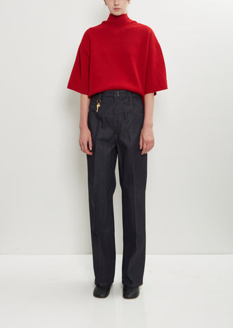 Carven washed jeans with straight legs and crease details in dense Japanese selvedge denim. Features belt loops, 5-pocket construction, a gold-toned key charm and baroque pearl detail at waist, and button, hook and eye zipper fastening. Relaxed fit.