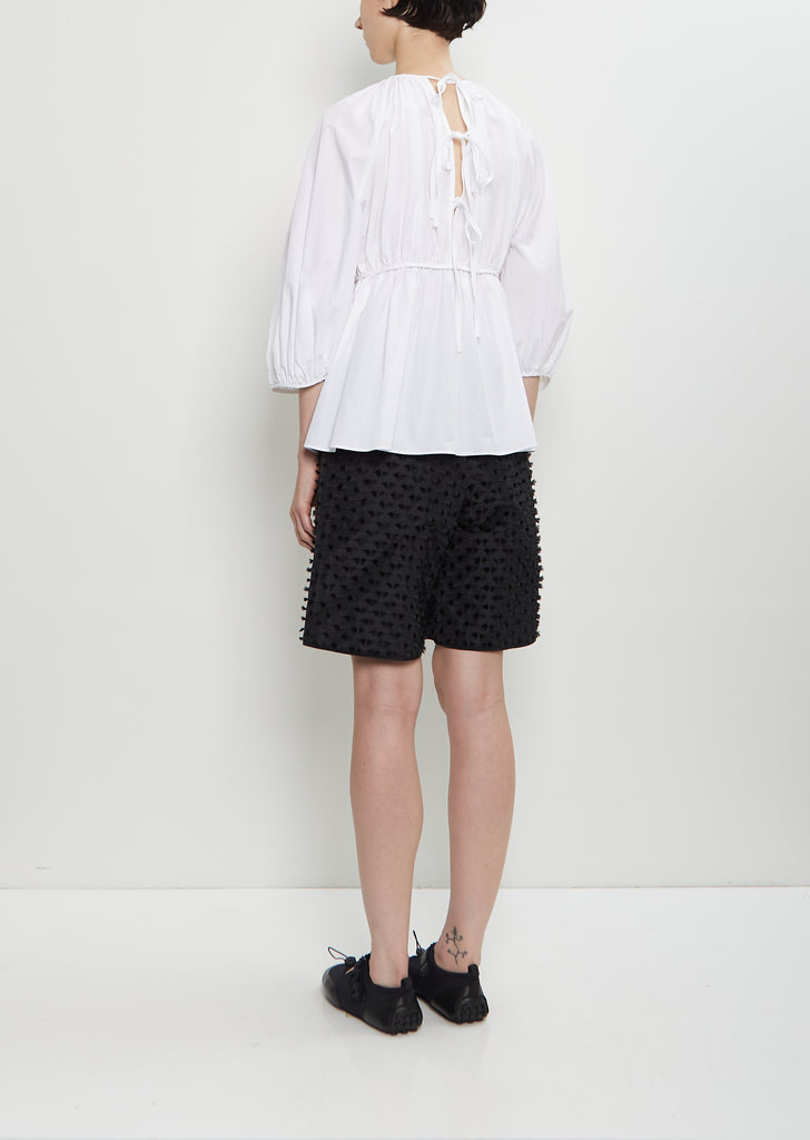 Cecilie Bahnsen white top with a round neckline and gathering along neckline and waist detail in soft cotton poplin. Features balloon raglan half sleeves, gathering at cuffs, and three bow ties closure at back neck. Soft peplum silhouette.