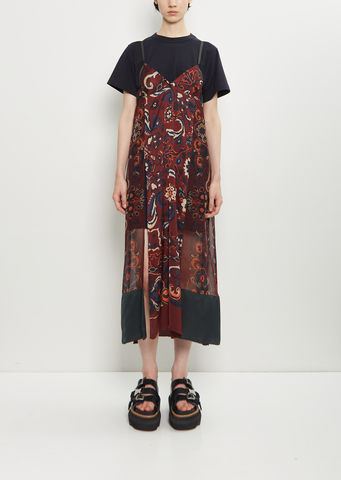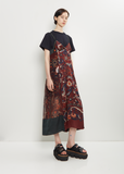 Sacai navy short sleeve t-shirt dress with a floral print voile dress overlay in cotton jersey. T-shirt dress features a ribbed crew neckline and chest patch pocket. Floral dress features thin adjustable grosgrain straps, a V-neckline, empire waist, and slit at right side. Can be worn together or separate.