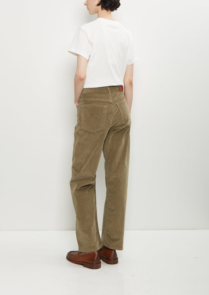 Studio Nicholson green pant with wide, straight legs in cotton corduroy. Features belt loops, 5 pocket construction, and button and zip-fly closure. Relaxed fit.