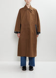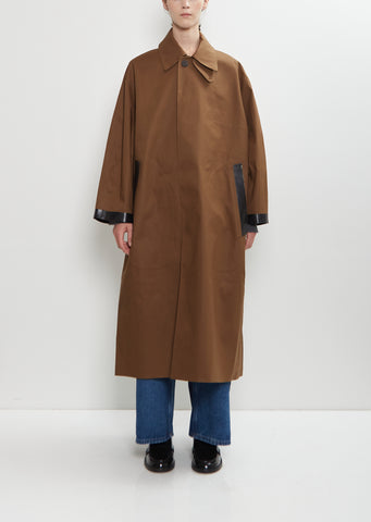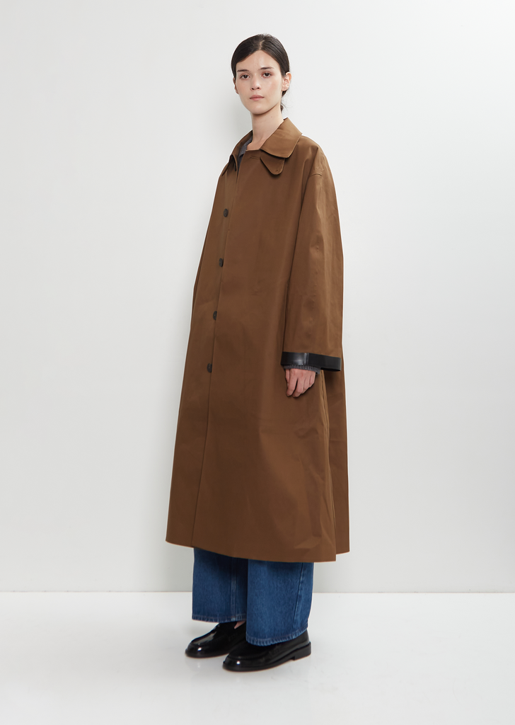 Studio Nicholson in collaboration with Mackintosh brown coat with a classic collar and concealed button front in bonded rubber cotton. Features a single exposed button at neck, button tab detail at collar, dropped shoulders, vertical welt pockets, taped cuffs and pockets, silver-toned rivet detail under arms, vent at back, and an interior welt pocket. Comes unlined.