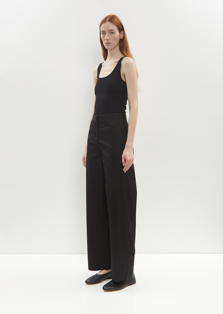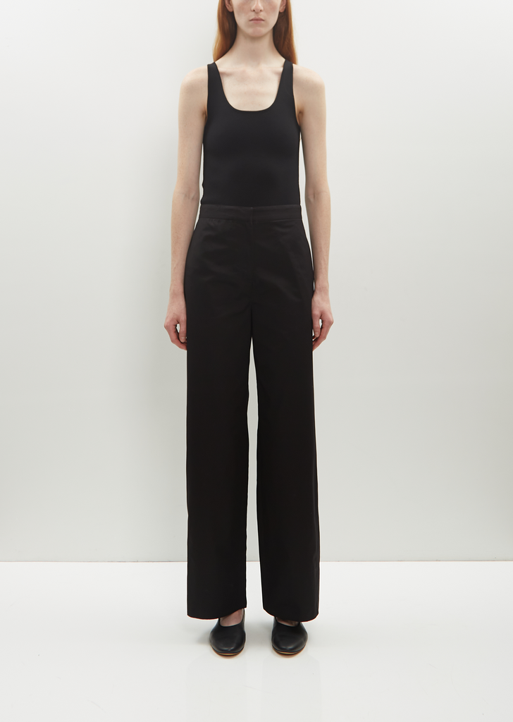 Toteme black trousers with wide, straight legs and twisted side seams in an airy organic cotton poplin. Features side seam pockets, patch pockets at back, and a button, hook and eye, zipper closure.