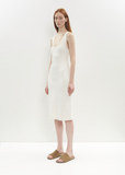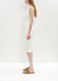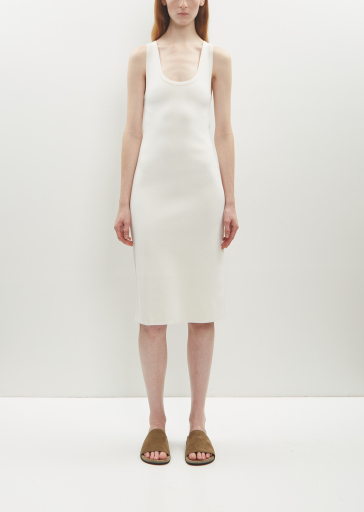 Toteme white pullover tank dress with a scoop neckline in a compact knit jersey. Features a straight hem and contrasting ribbed trim finish at neckline and armholes. Closer fit.