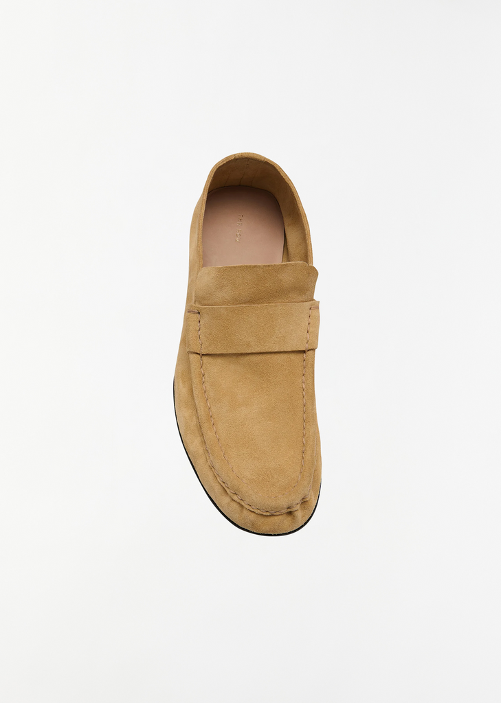 The Row yellow lightweight moccasin with an oval toe and stitched vamp strap in soft calfskin suede. Features a stacked heel and leather sole.