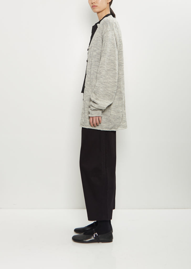 Y's off white and grey mélange cardigan with a V-neckline and black button front in mid-weight wool cable knit. Features dropped shoulders, elongated sleeves, side seam pockets, ribbed trim finish at neckline, and rolled edge finish throughout placket and at cuffs and hem. Oversized fit.