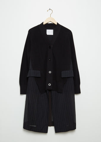 Sacai navy striped v-neck cardigan with sheer underlay in cotton poly blend. Features knit upper, sheer skirt, flap pockets, and a button front closure.