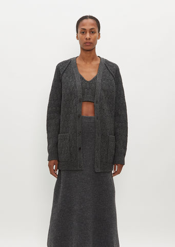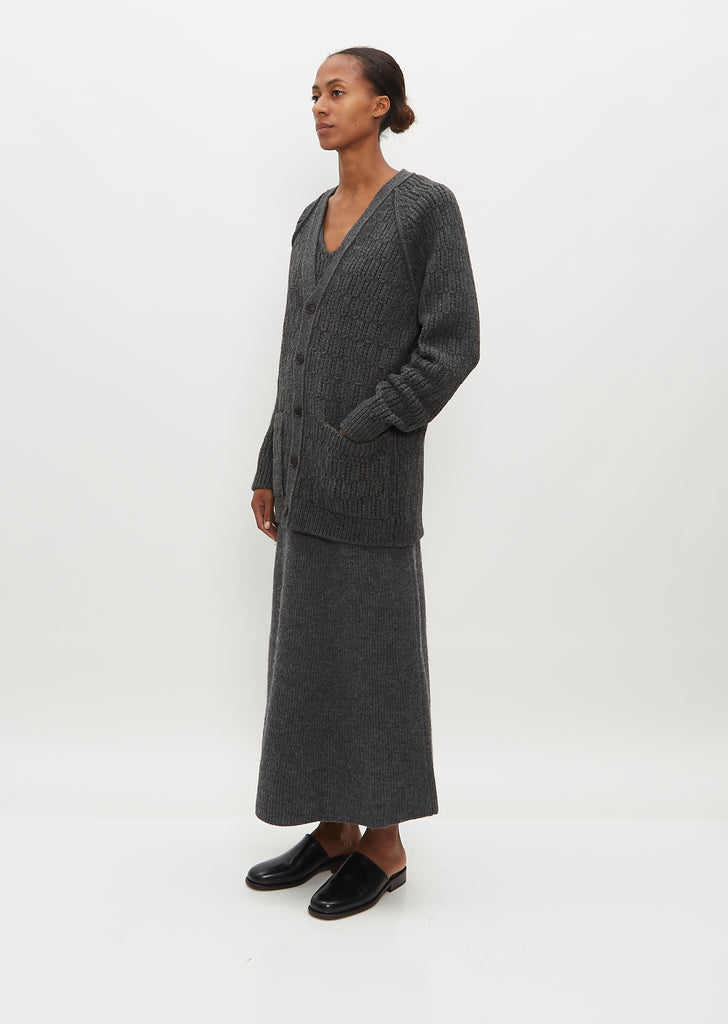 Auralee charcoal grey oversized cardigan with a v neckline knit in pure corded wool. Features