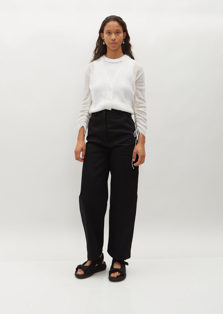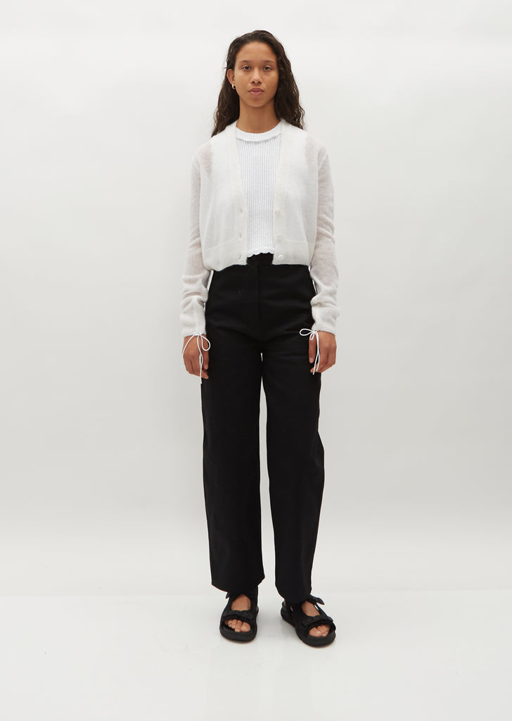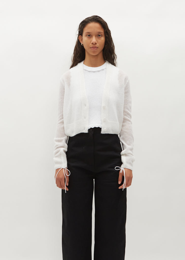 Cecilie Bahnsen white cropped cardigan with adjustable ruched sleeves knitted in a loose gauge lightweight alpaca and wool blend. Finished with a rib trim at V-neckline, sleeve cuffs and hem.