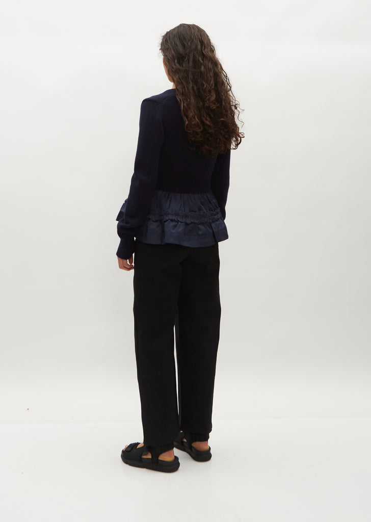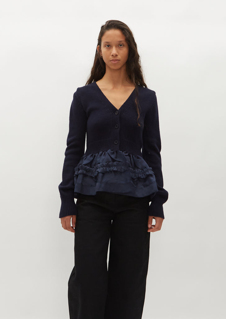 Cecilie Bahnsen navy cardigan with ruffle hem detail knitted in tight gauge mid-weight recycled cashmere. Peplum silhouette with a closer fit.