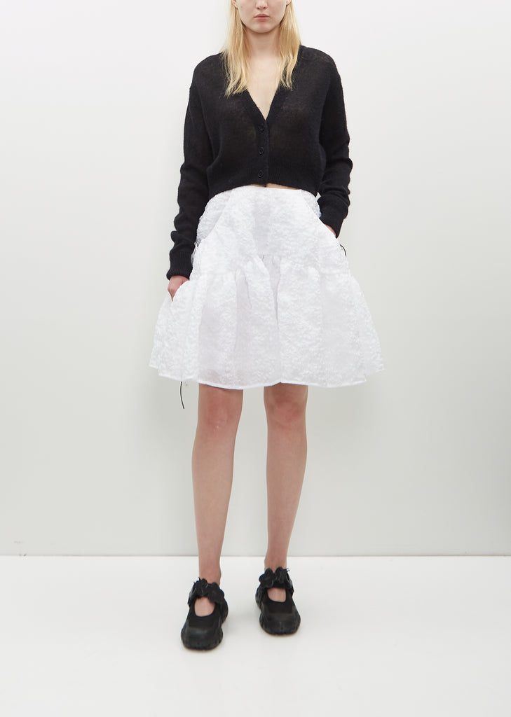 Cecilie Bahnsen black cropped cardigan with adjustable ruched sleeves knitted in a loose gauge lightweight alpaca and wool blend. Finished with a rib trim at V-neckline, sleeve cuffs and hem.