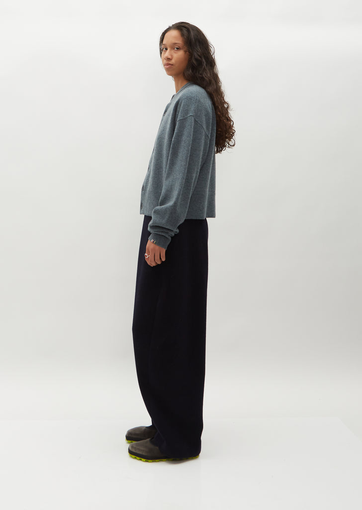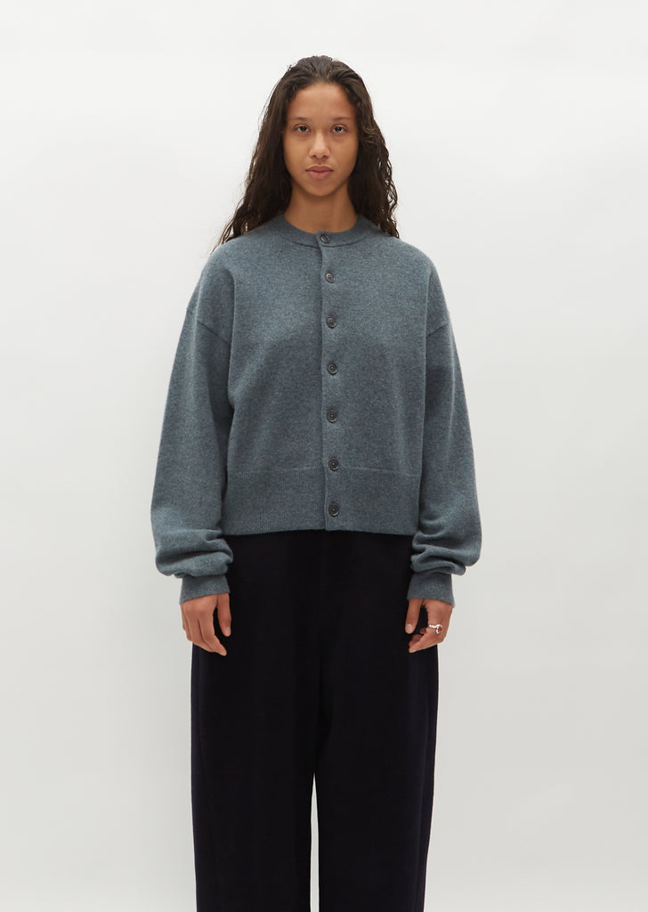Brand Signature Piece — Extreme Cashmere grey blue cropped crewneck cardigan knitted in tight gauge cashmere blend. Straight silhouette with a relaxed fit.