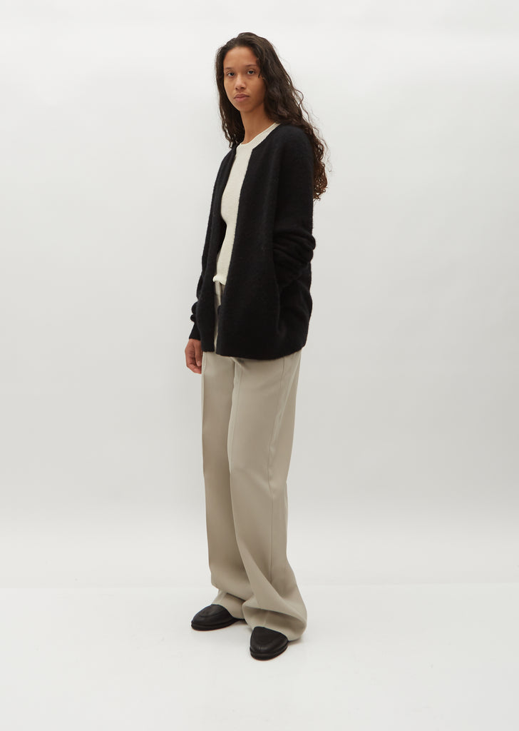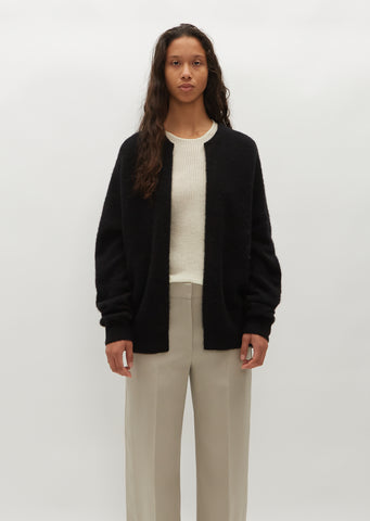 Frenckenberger black open front cardigan with a round neck in mid-gauge cashmere blend. Boxy silhouette with a relaxed fit.