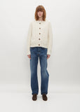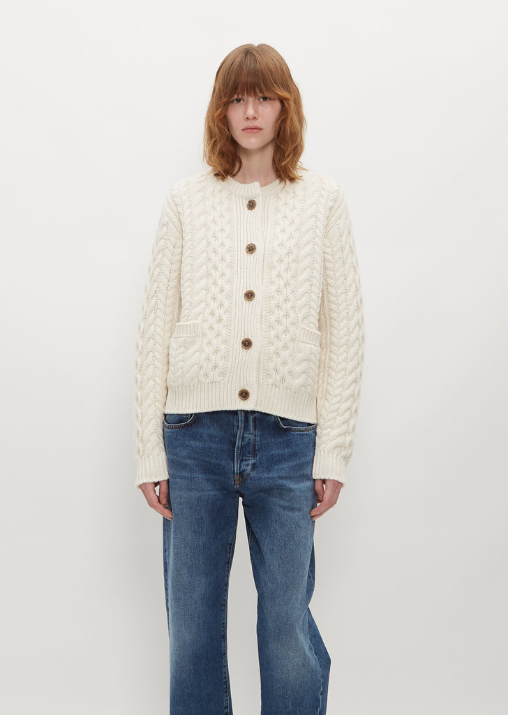 Lisa Yang cream round neck cardigan knitted in heavy gauge cable knit cashmere. Straight silhouette with a regular fit.