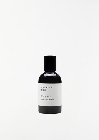 Perfumer H's 50ml smoke fragrance perfume spray. The smell of the air after burning wood is fused with damp earth, wild herbs and clean spices to create a masterfully unique amber. Top notes of geranium, cistus and coriander seed with a heart of chamomile, rose and cardamom on a smouldering base of birch tar, agar, cedar wood and santal Mysore, with warming resins of benjoin and frankincense.
