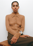 Cecilie Bahnsen chestnut brown cardigan with soft collar and tonal buttons closure at front in lightweight mohair and wool blend open knit. Features rib trim finishings at collar, placket, cuffs, and hem. Closer fit.