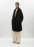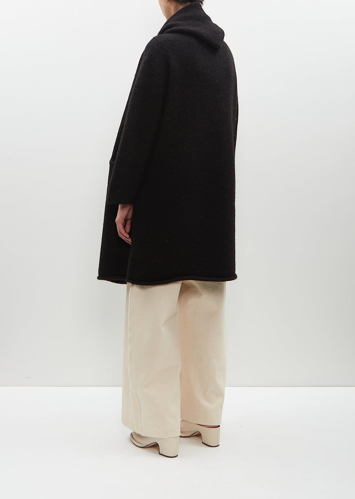 Brand Signature Piece — Lauren Manoogian signature Capote coat in black. Knitted in felted mid-weight alpaca knit with slight stretch, this versatile sweater coat features a hood, dropped shoulders and self-lined front slit pockets. Finished with a rolled hemline. Subtle cocoon silhouette with an oversized fit. Comes unlined.
