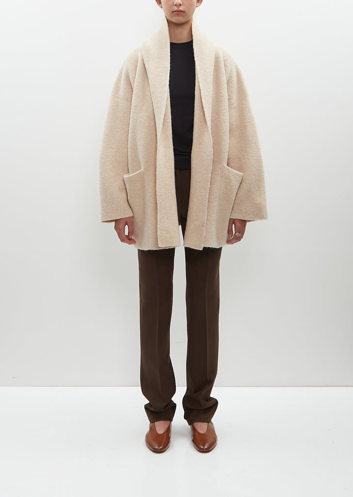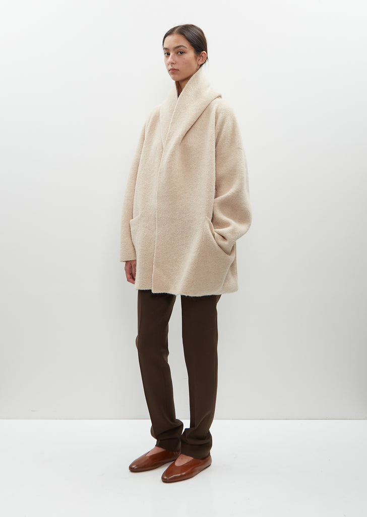 Lauren Manoogian alabaster oversized short coat with a wrap open front and wide draped collar in double faced alpaca and extra fine merino wool blend knit. Features deep patch pockets, straight hem and clean finished edges. Comes unlined. Relaxed fit.