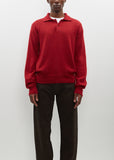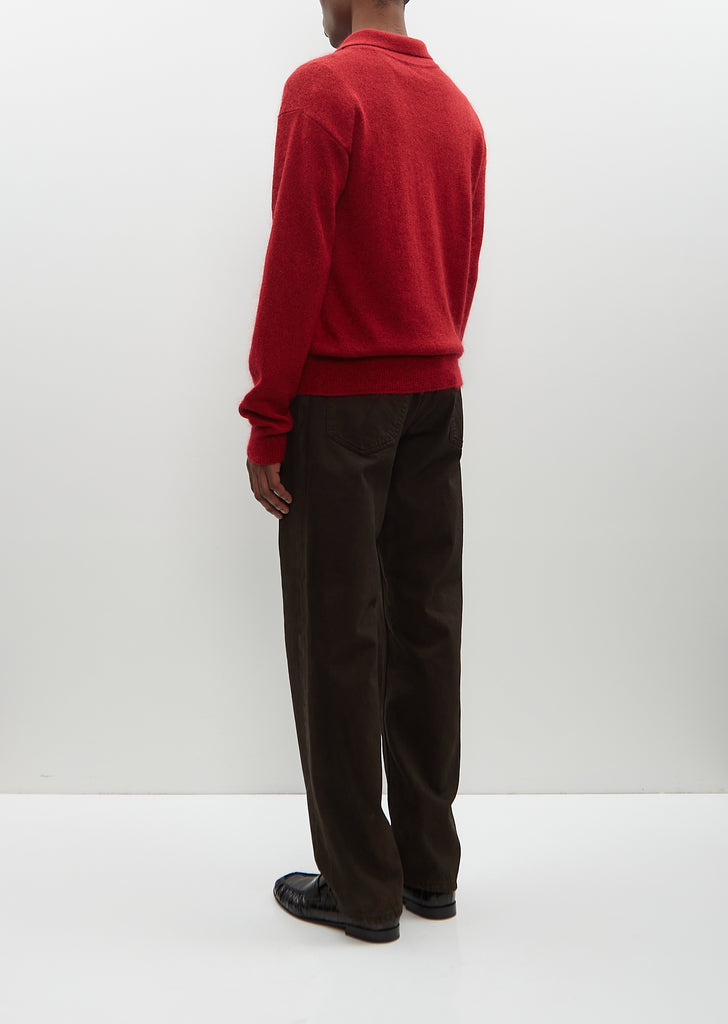 The Row candy red mèlange long-sleeved polo with 2-button collar in silk and mohair tweed. Features dropped shoulders and rib trim at collar, cuffs, and hem.