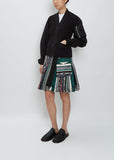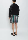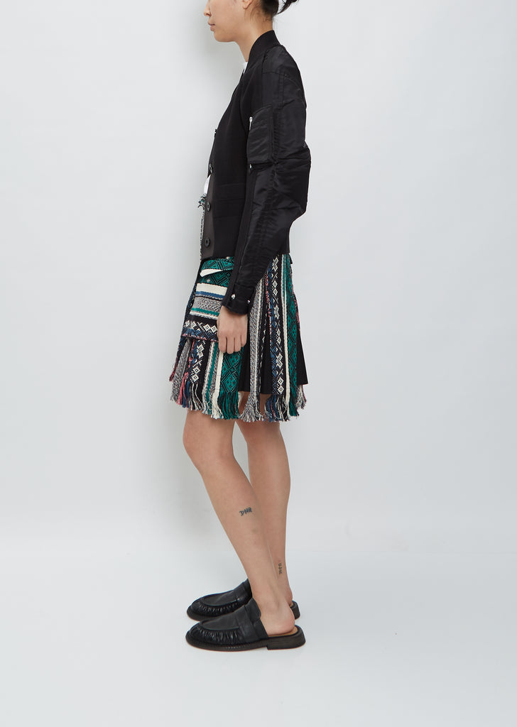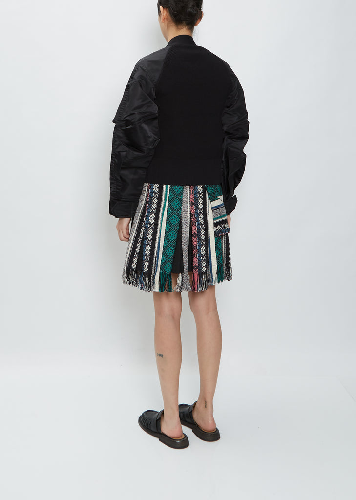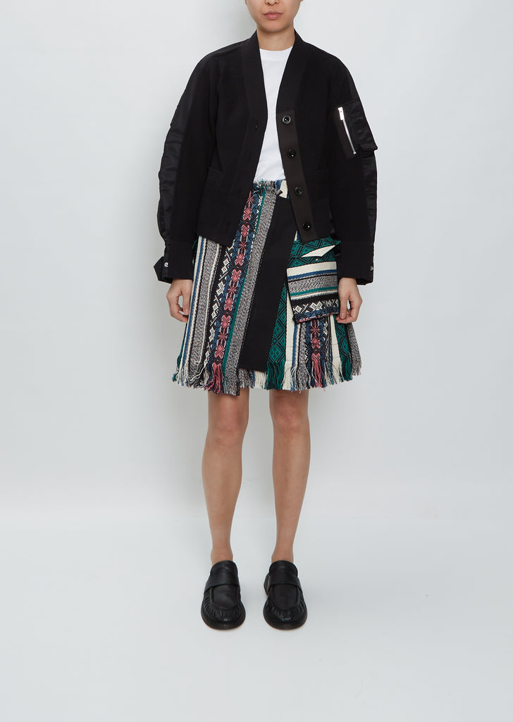 Sacai black v-neck cropped cardigan with nylon twill cargo zipper pocket sleeves in a cotton rib knit.