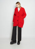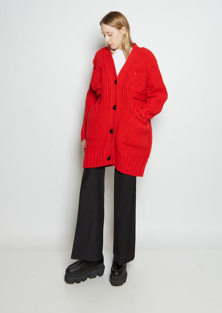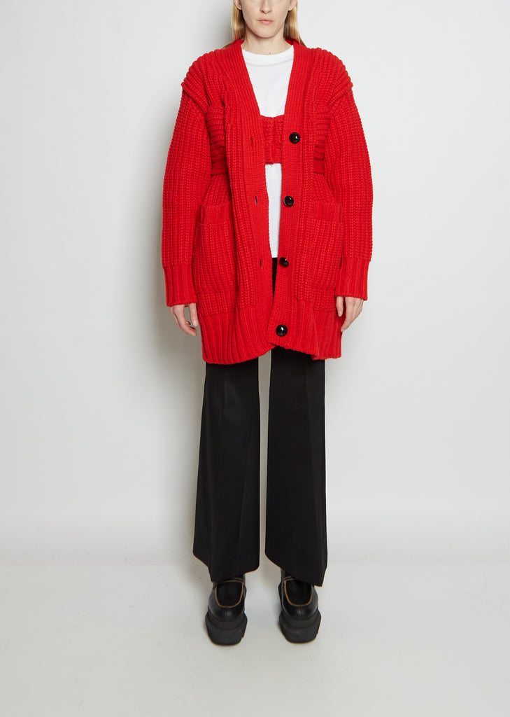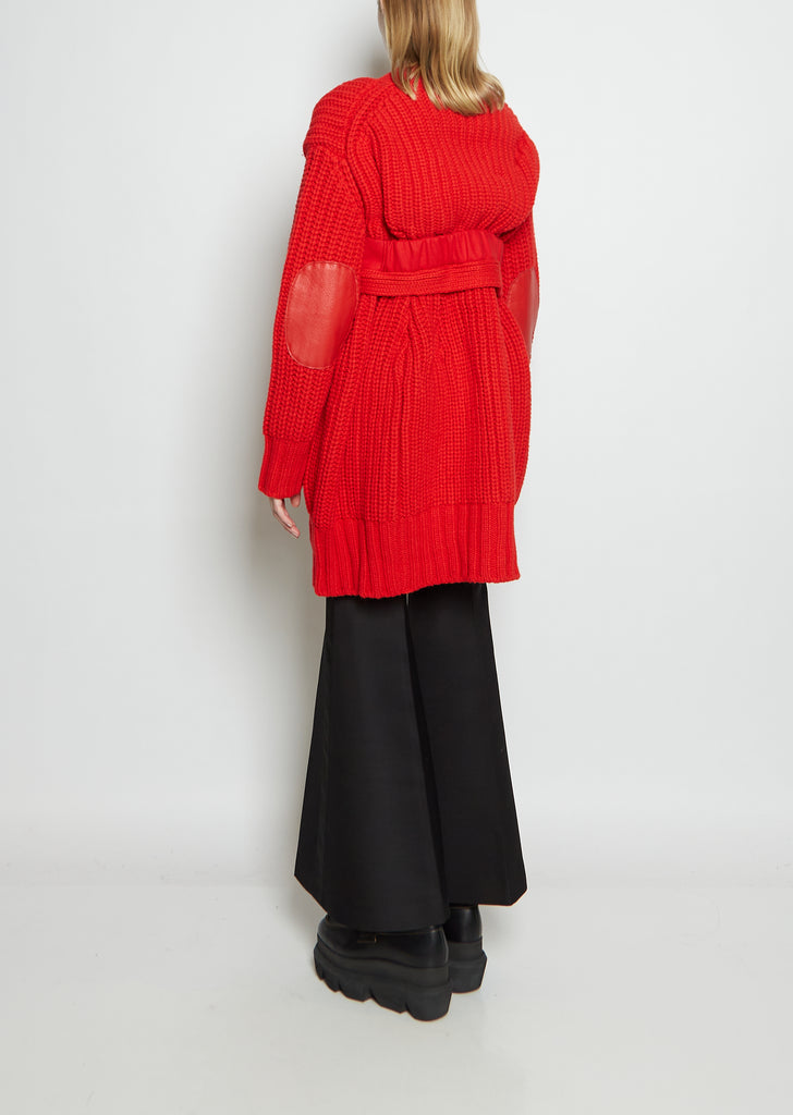 Sacai red long chunky ribbed cardigan with knit overlay at chest that can be buttoned under the cardigan. Features front patch pockets and wide rib trim at button placket, sleeve cuffs and hem. Tonal leather arm patches. Black leather covered button front closure. Oversized fit.