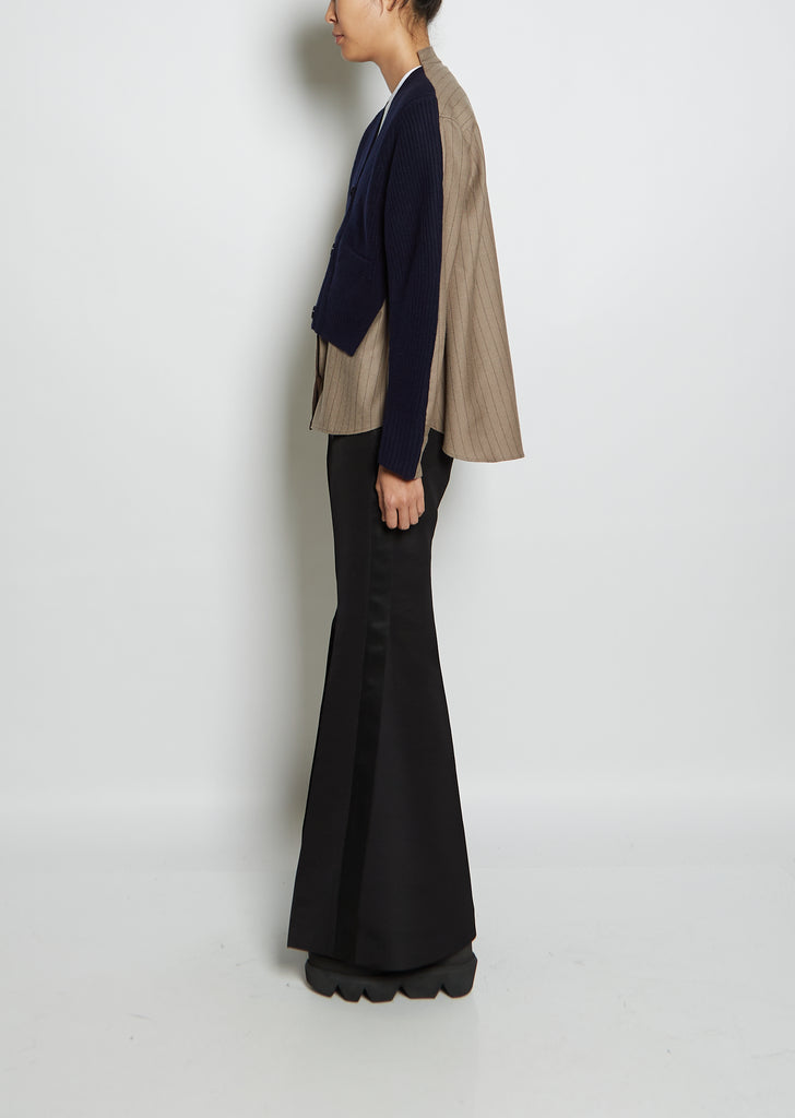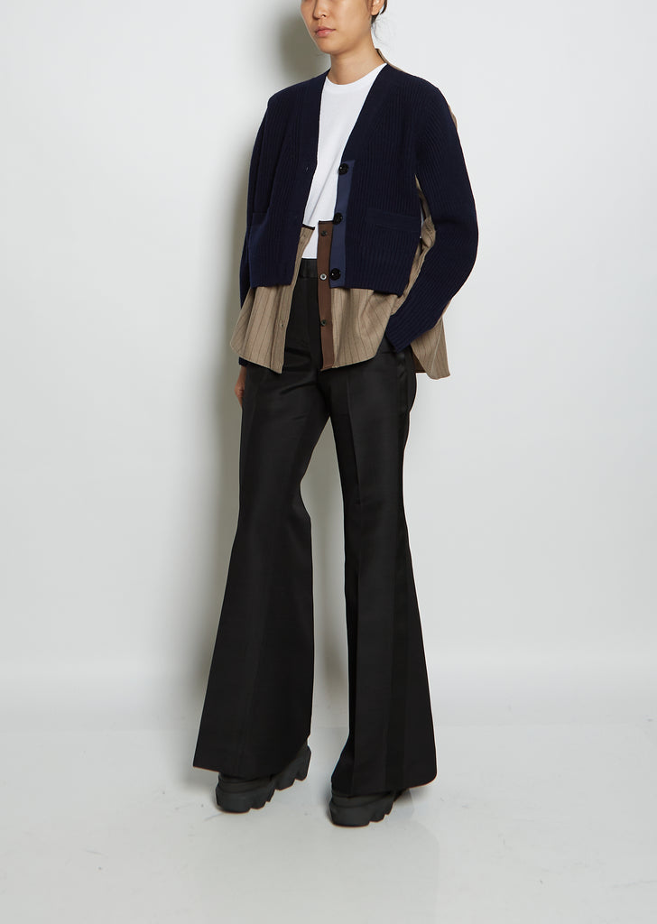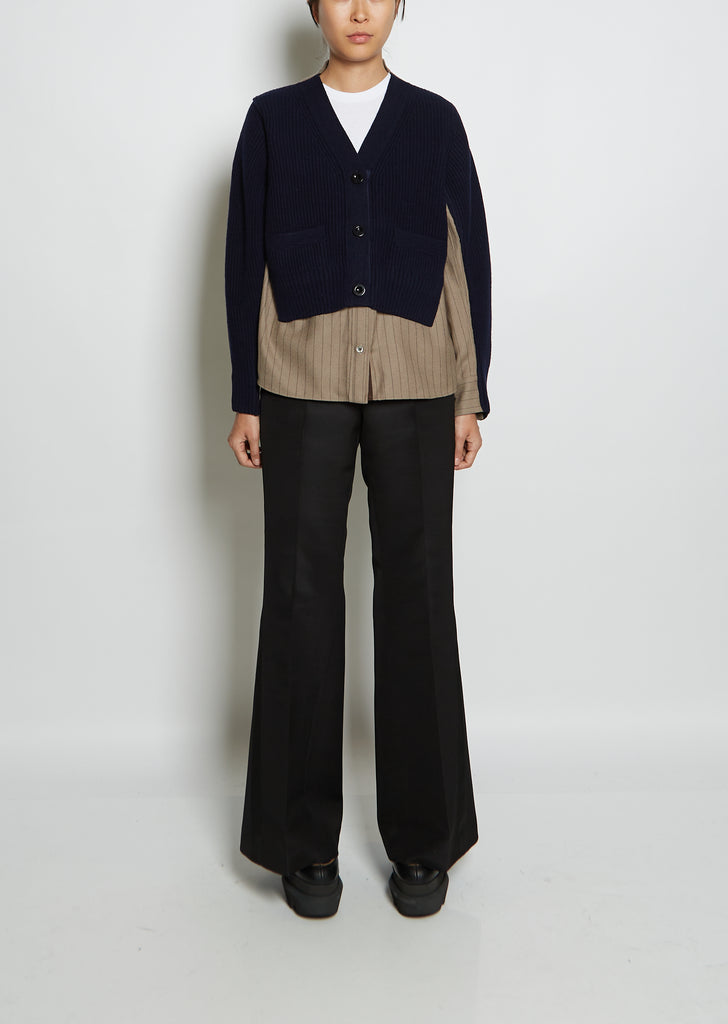 Sacai navy wool rib knit cardigan sweater with a beige pinstriped shirting under-layer, sleeve and back panel. Detailed with front welt pockets, a back yoke and box pleat.