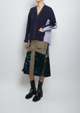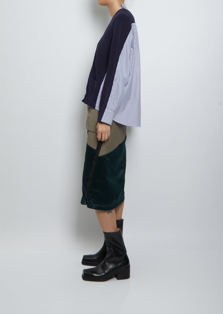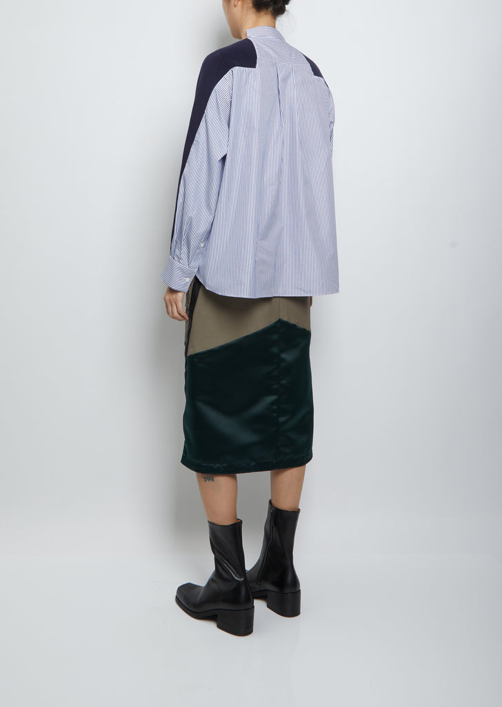 Sacai navy and white striped paneled cardigan shirt in a cotton poplin shirting and rib knit.
