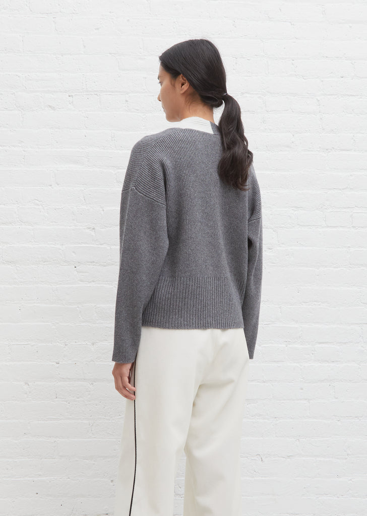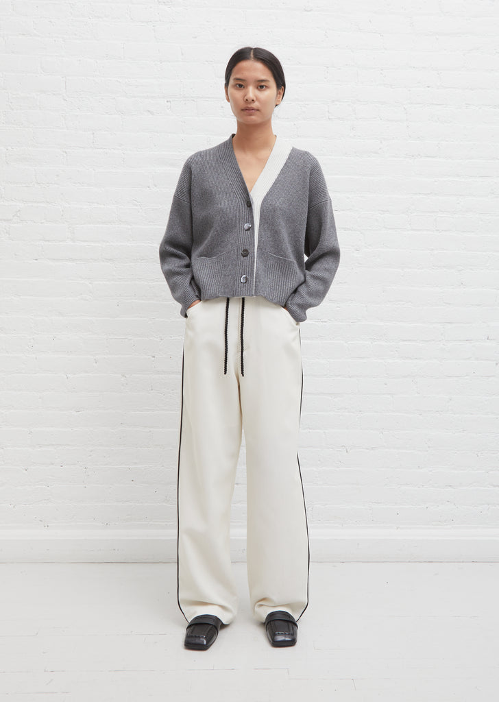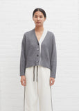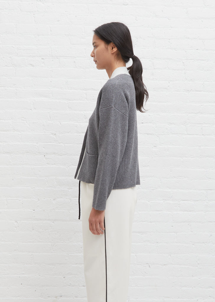 Sara Lanzi grey 4-button ribbed cardigan with asymmetrical white placket to one side and ribbed patch pockets in merino wool & cashmere blend knit. Dropped shoulders. Cropped, boxy fit.