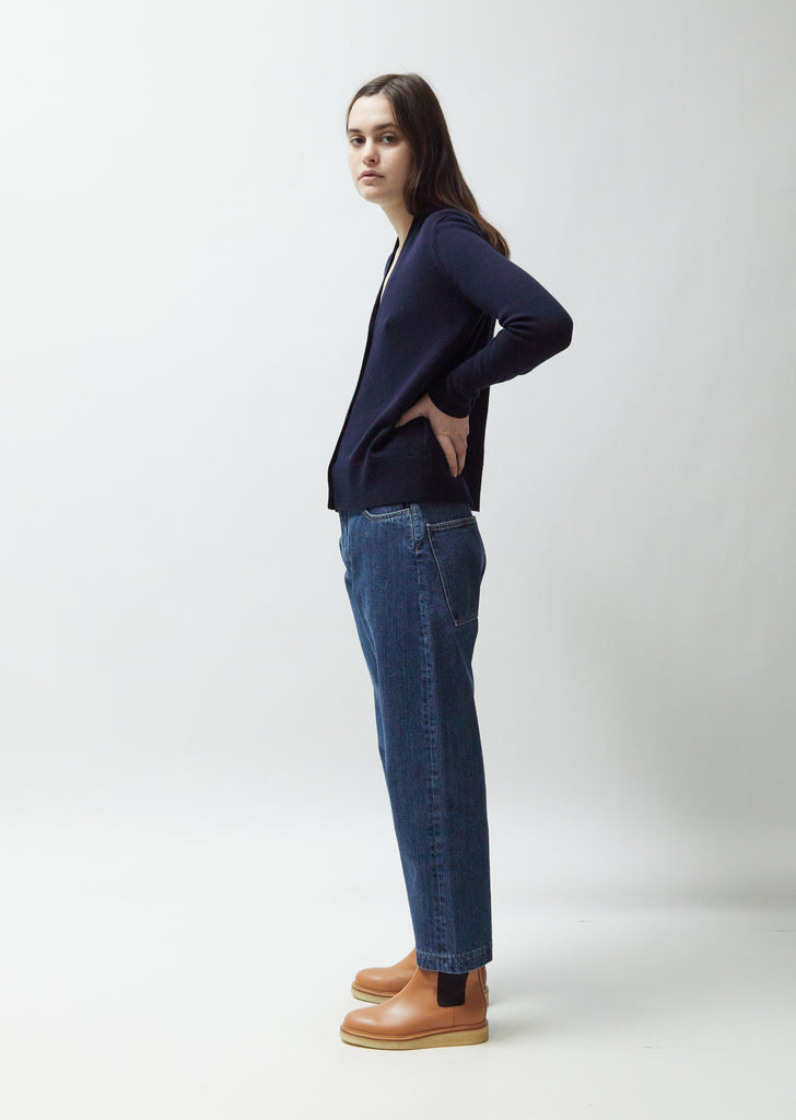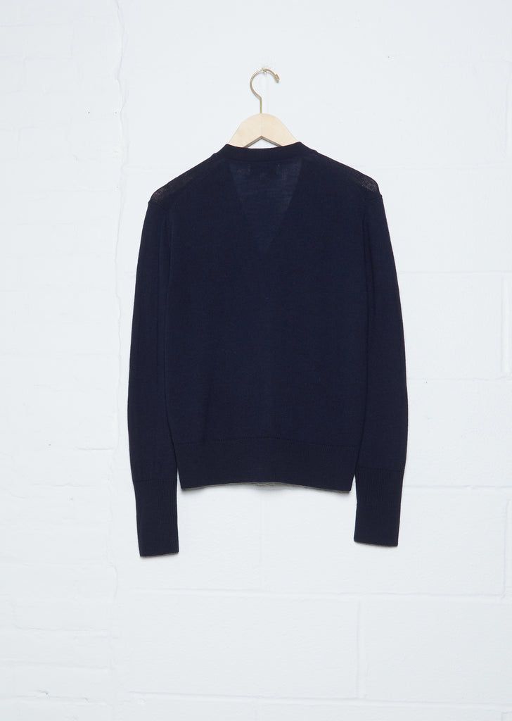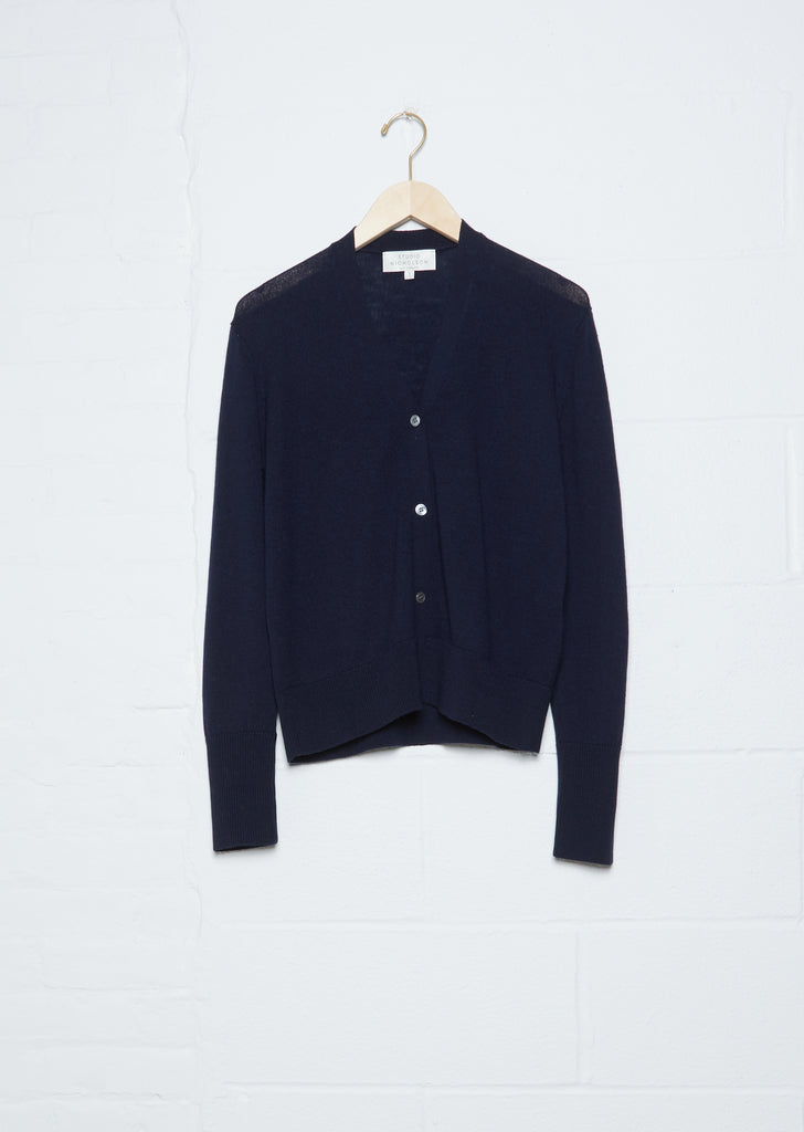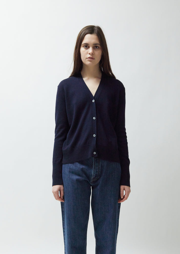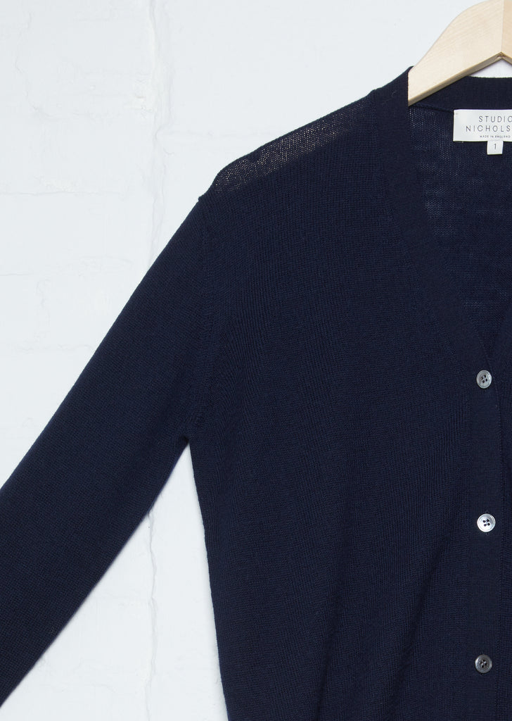 Studio Nicholson lightweight v-neck cardigan in a black merino wool. Features tonal buttons with rib trim finishings at the neckline, sleeve cuffs and hem. Relaxed fit.