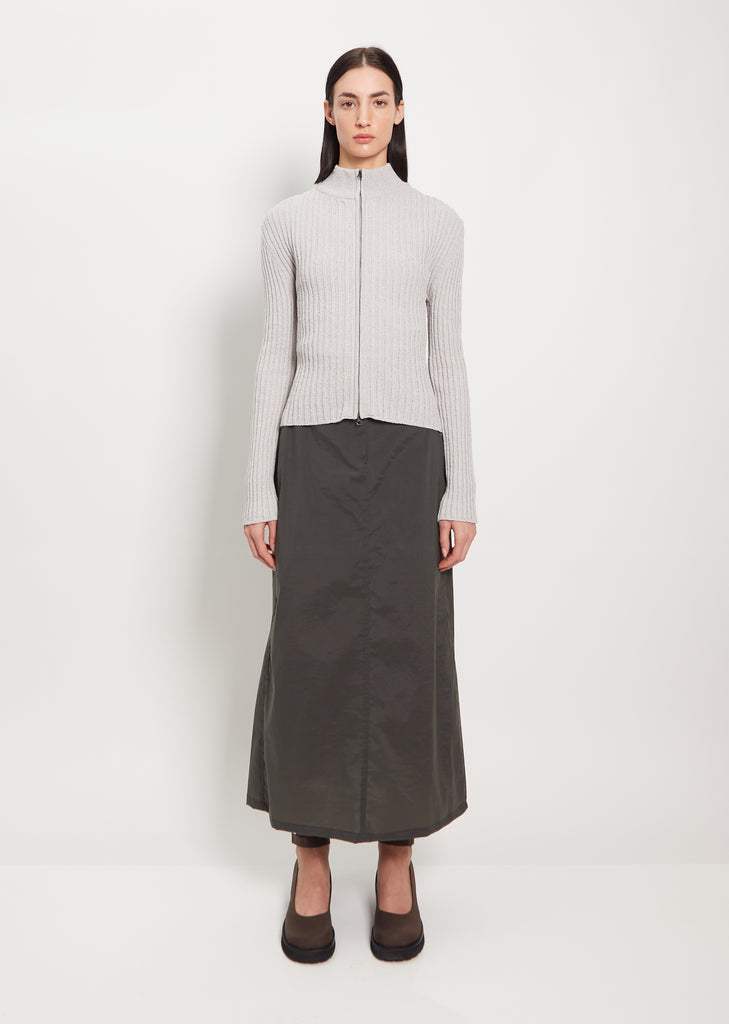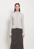 Amomento grey cropped cardigan with a high neck in ribbed cotton blend knit with stretch. Features fine rib trim finish on neck and two way front zip in silver toned hardware. Can be worn as an outer layer or on its own zipped.