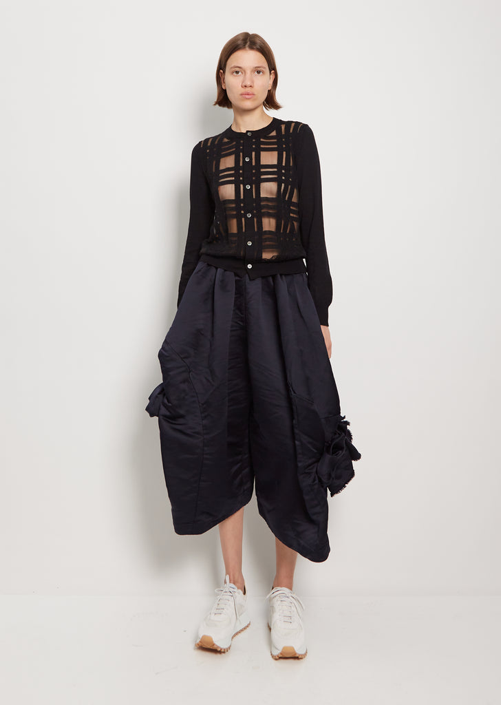Comme des Garçons Comme des Garçons black sheer front check cardigan with round neckline in wool blend knit. Features rib trim finish along neckline, placket, cuffs, and hem. Button front closure. Relaxed fit.