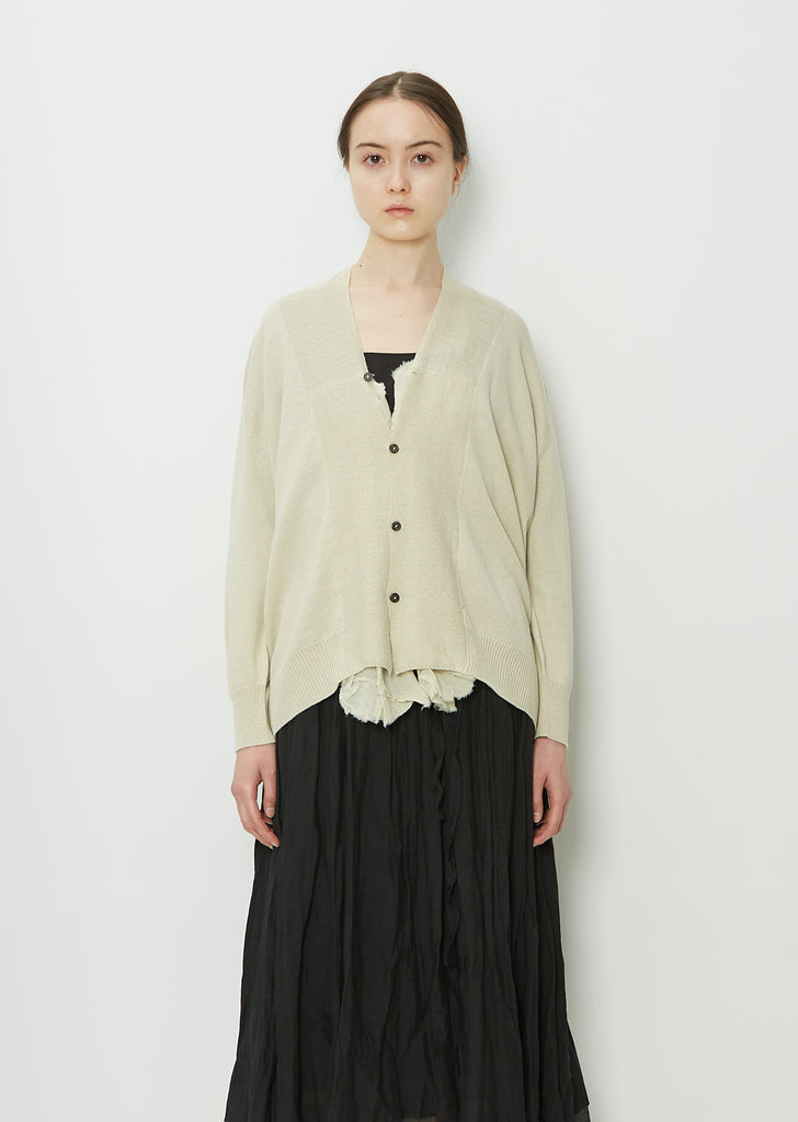 Pas de Calais natural knit cardigan with ruffle front underlay in cotton, linen, and wool blend knit. Features a v-neckline, button front closure, and rib trim finished hem and cuffs. Oversized fit. Relaxed fit.