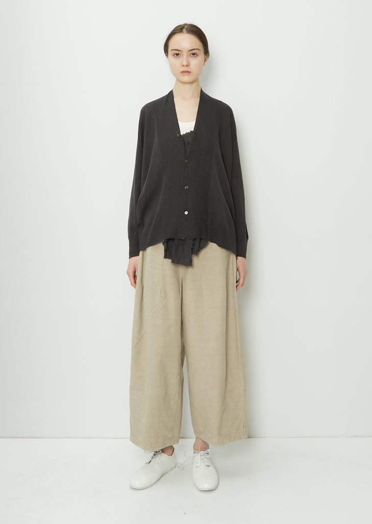 Pas de Calais charcoal knit cardigan with ruffle front underlay in cotton, linen, and wool blend knit. Features a v-neckline, button front closure, and rib trim finished hem and cuffs. Oversized fit. Relaxed fit.