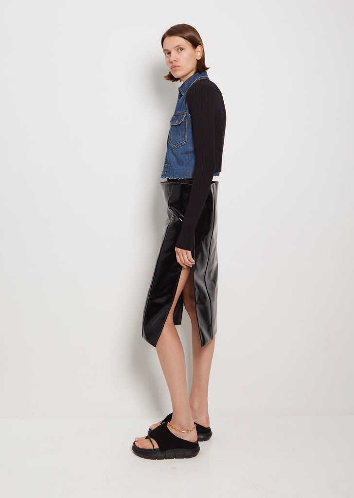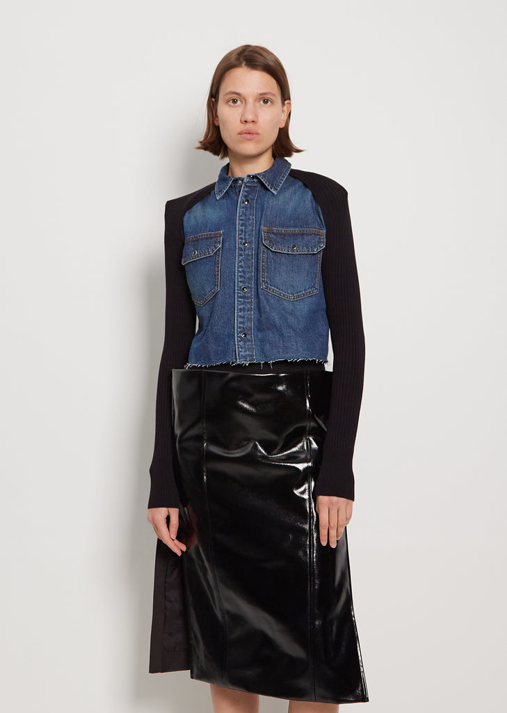 Sacai blue denim shirt jacket with ribbed sweater sleeves and back panel in contrasting black. Features double flap chest pockets, and raw edge finish at hem. Snap closure at front and at flap pockets. Closer fit.