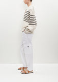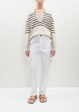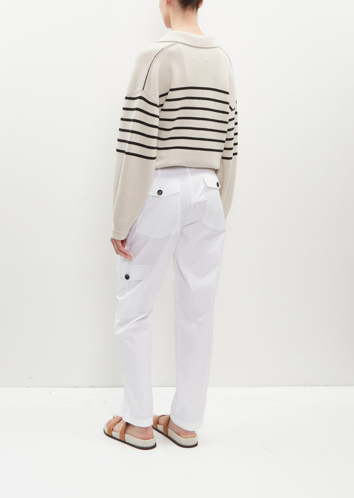 Maria McManus white cargo style trousers with straight legs in cotton poplin. Features slash side pockets and patch pockets at back and side legs. Contrast black button closure with zip-fly fastening.
