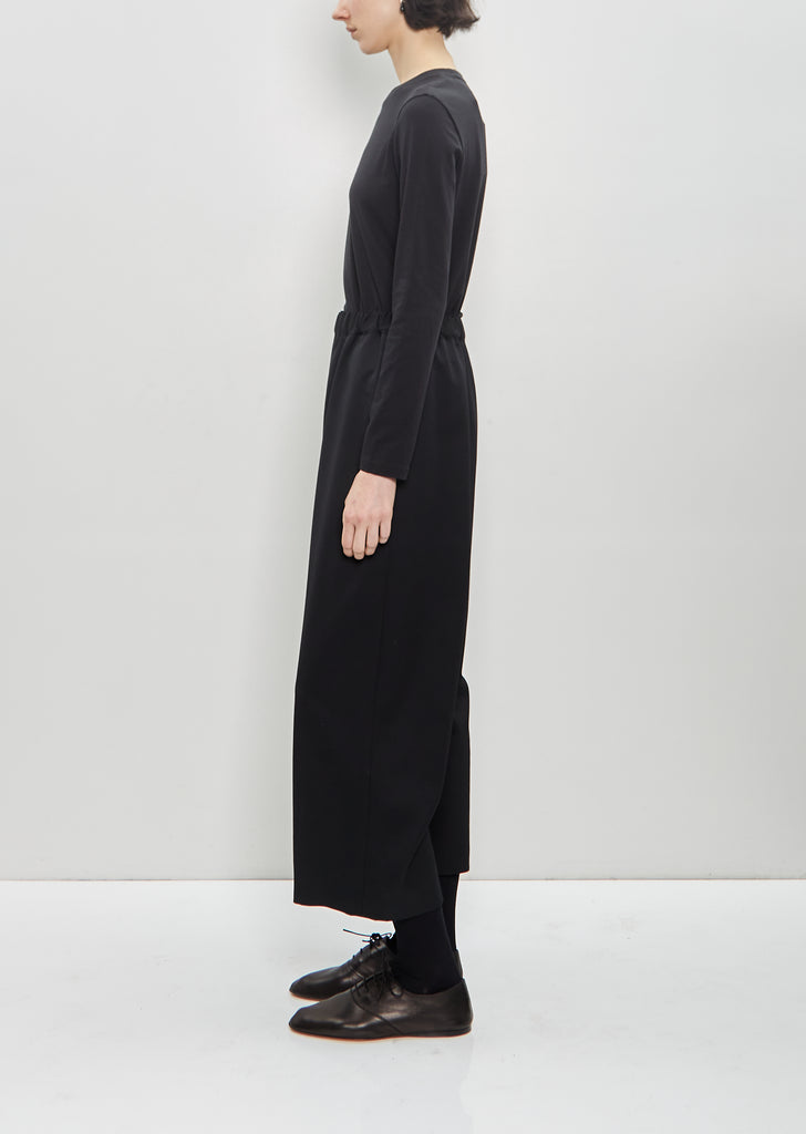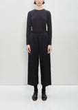 Comme des Garçons Comme des Garçons black pull-on pants with cropped, wide legs in lightweight wool gabardine. Features an elasticated waistline and side seam pockets.